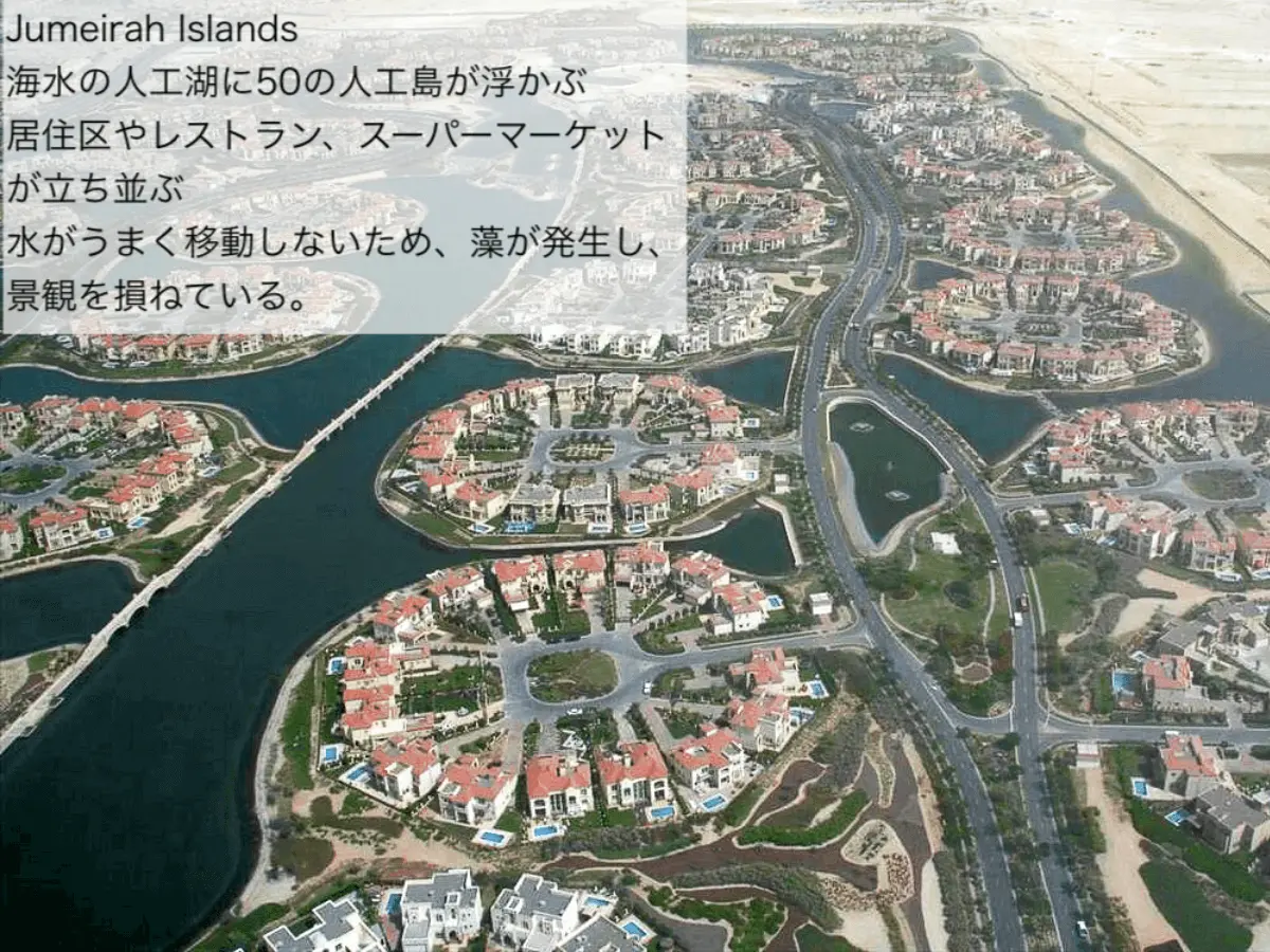 Palm Jumeirah, situata a Dubai negli Emirati Arabi Uniti, è una famosa isola artificiale a forma di palma, accanto alla quale si trova Jumeirah Islands. Jumeirah Islands è un resort costituito da 50 isole artificiali, ognuna circondata da una vasta laguna artificiale, con una superficie totale di 664,934 m² e una capacità d’acqua di 1,492,890 tonnellate. L’acqua è composta principalmente da acqua marina e acqua sotterranea, ma a causa della complessità della forma della laguna, il ricircolo dell’acqua non funzionava correttamente, causando problemi di inquinamento e odore.