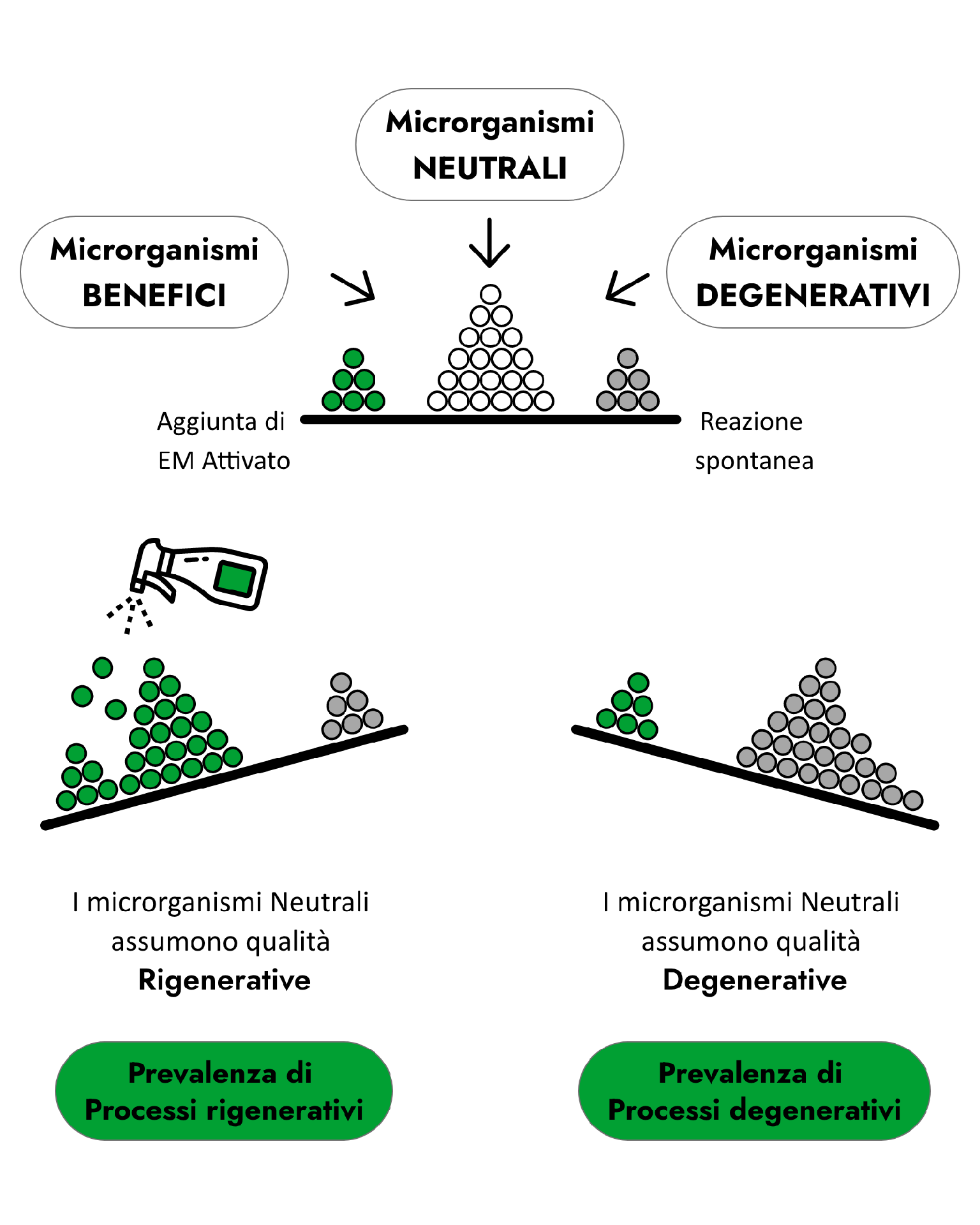 Il funzionamento degli organismi microbici efficaci (EM) si basa su un principio semplice. Nella natura, circa il 70% dei microrganismi esistenti possiede caratteristiche neutre o opportuniste, mentre una piccola percentuale, circa il 15%, è degenerativa e la restante, anch’essa il 15%, è rigenerativa.